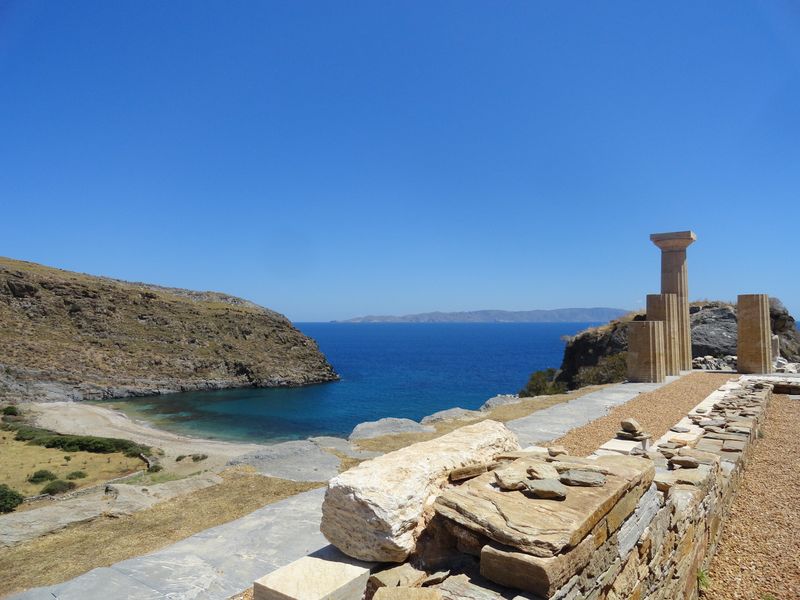 Therefore, there are are many places of significant archeologicacal and historical interest, really important and worth visiting. The most significant of them , Karthea, located at the Southeast part of the island, lying on the shore of a remoted and magnificent bay, consisting of two major temples, the Apollo temple and the godess Athena temple and a very recently discovered ancient theater. The acropolis was surrounded by huge walls. The ancient (classical) harbours pier lies today 3 meters underwater and is visible from the suface. It was about 140 meters long and 35 m wide and connected the city with the nearby islet. It is considered that the first inhabitants of the area are dating back at the geometric era (110-700 bc). The city was on its peak at the classical period. Currently the site is accessible only by a trekking pathway, 15 hours walk, after half an hour drive from the town , or by boat.